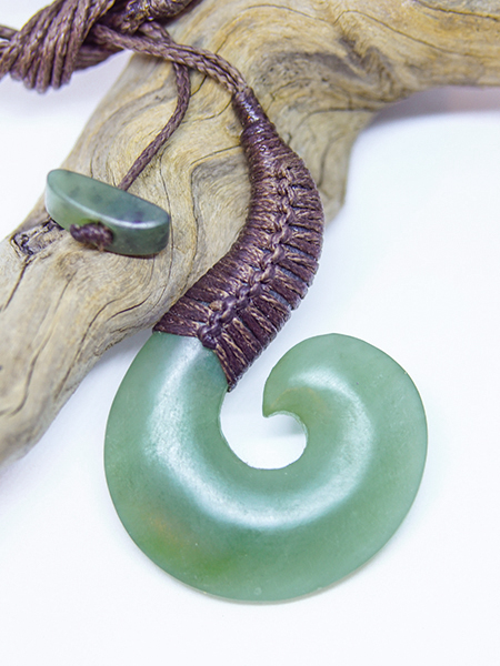 289,00 €Offenes Koru, traditionell eingebunden, in seidenmattem Finish am Wachsband mit Schlaufe und Jadeknebel.