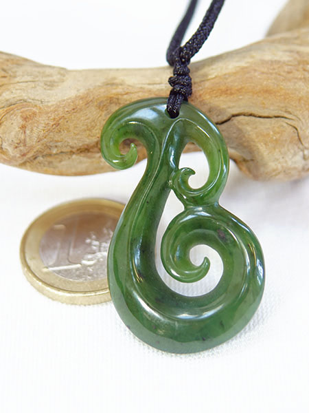 289,00 €Offenes Koru, traditionell eingebunden, in seidenmattem Finish am Wachsband mit Schlaufe und Jadeknebel.