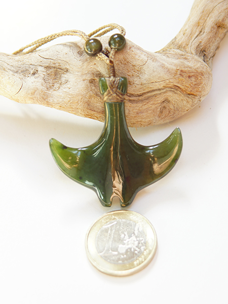 129,00 €Stilisierter Manta-Rochen, eingeflochten in braunes Flechtband mit Jadeperlen-Schiebeknoten. Carving aus dunkelgrüner Nephrit Jade, Hochglanz-Finish. Das Carving wird in einer kleinen Samttasche geliefert.