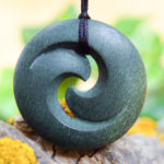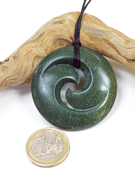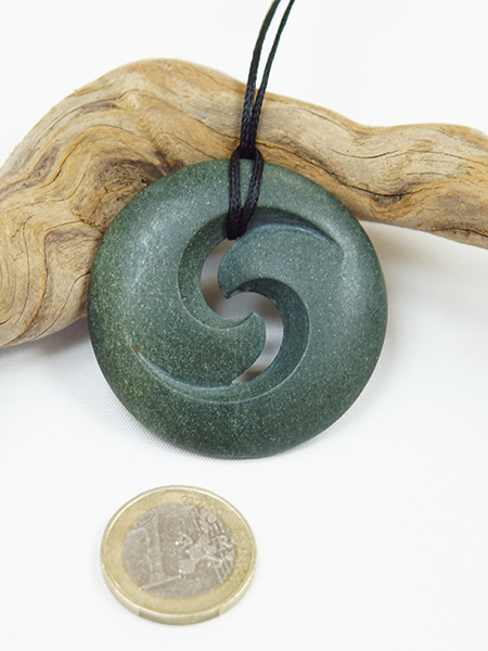 Rua Koru Carving aus Argillit am traditionellen Wachsband mit Jadeknebel, mattes Finish. Das Pendant ist auf beiden Seiten – Vorder und Rückseite – detailliert ausgearbeitet.