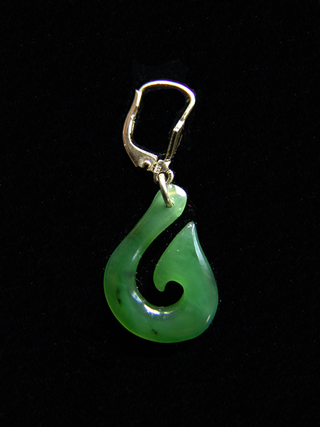 Hook Matau Set, bestehend aus einem leuchtend grünen Nephrit Jade Anhänger an einer 1.2 mm x 45 cm. langen Panzer-Kette aus 333er Gold und den dazu gehörigen Ohrhängern, die Klappbrisuren ebenfalls 333er Gold.