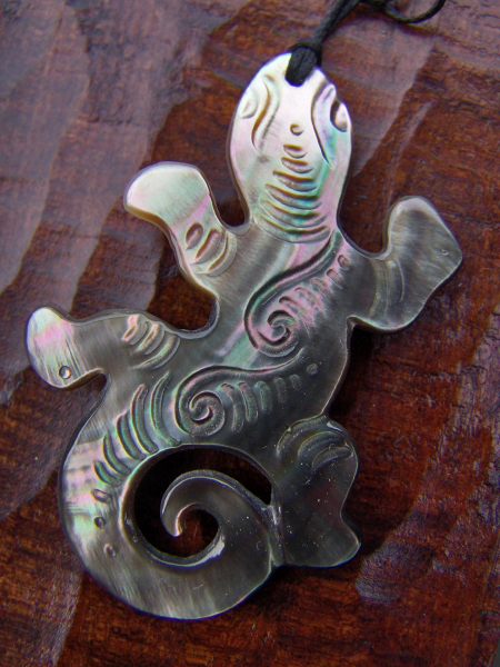 Tuatara – Eidechse, geschnitzt aus dem Perlmutt der schwarzlippigen Perlmuschel am Wachsband mit Schiebeknoten. Glänzendes Finish.