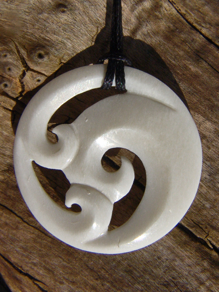 Tekoteko Carving aus Nephrit Jade am traditionellen Wachsband mit Schiebeknoten, seidenmattes Finish. Das Amulett ist auf beiden Seiten – Vorder und Rückseite – detailliert ausgearbeitet.